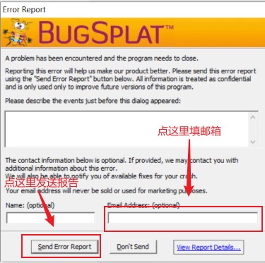 如重新安装最新版本后仍然出现报错,请您在报错弹窗里填写您的邮箱,然后点击发送报告,并联系在线客服告知我们您的邮箱和具体情况。