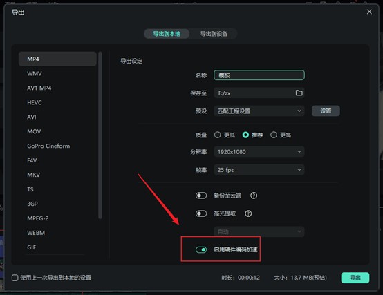 - 点击导出后,改变导出界面下方的【启用硬件编码加速】设置,如下图: