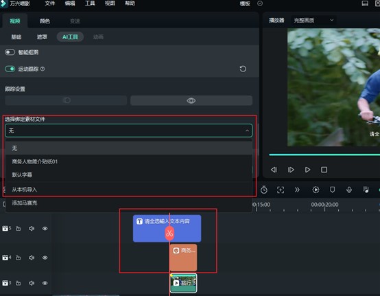 - 跟踪完成后,在视频的上方轨道添加您想绑定的素材,然后在运动跟踪的绑定素材下拉框中选择需要的素材进行绑定即可。