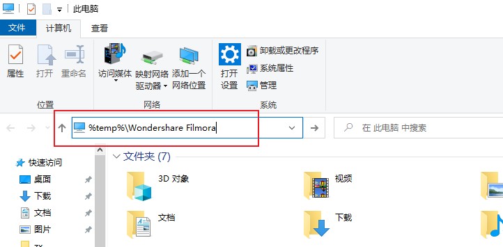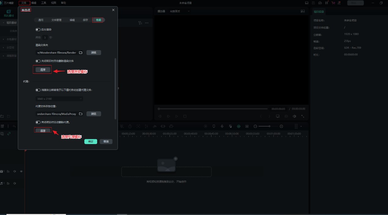 请先检查您的原视频在本地是否可以正常播放。如本地播放正常,请按照以下步骤操作: (1)在软件编辑界面点击左上角文件 > 首选项 > 性能,点击清理渲染缓存和代理缓存,点击确认保存,如下截图所示 (2)关闭软件,打开电脑上的文件资源管理器,输入%temp%\Wondershare Filmora,按回车键进入软件缓存目录 (3)找到并删除MediaInfo和MediaLibrary两个文件夹,重启软件后重新导入该素材验证。